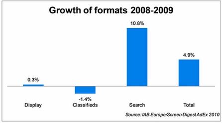 Während der Bereich Suchmaschinenmarketing im Jahr 2009 einen Anstieg von durchschnittlich 10.8 Prozent in Europa verzeichnete, geriet der Display Werbemarkt unter Druck und wuchs insgesamt nur noch um 0,3 Prozent. Vincent Létang, Senior Analyst bei Screen Digest, der den zugrunde liegenden AdEx Report für den IAB Europa auswertete: „SEA übertrumpfte letztes Jahr den Display Markt deutlich. Die Advertiser setzten ihren Focus 2009 vor allem darauf, ihren ROI mittels direkt respondierender Werbung zu erzielen. Dies geschah auf Kosten von Branding Maßnahmen. Zudem bezweifeln einige Werbungtreibende die Messbarkeit von Branding Maßnahmen. Inzwischen ist aber im 1. Quartal 2010 eine Erholung des Display Marktes festzustellen.”