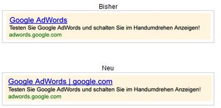 Auch für die Werbetreibenden soll diese Neuerung von Vorteil sein:Wenn die Domain schon im Titel angezeigt wird, können sie den verbleibenden Platz in der Anzeige für andere wichtige Infornationen nutzen. Die vollständige URL wird weiterhin wie gewohnt unterhalb der Textzeile angezeigt.