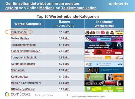 Doch welche Branchen setzen überhaupt auf Bannerwerbung in den Social Networkst? Mit 6,10 Mrd. Ad Impressions wirbt der Einzelhandel innerhalb der Social Networks am meisten. Die Topwerbemarke unter den Einzelhändlern ist Zalando. An zweiter Stelle der Werber stehen die Onlinemedien selbst, angeführt von icq.