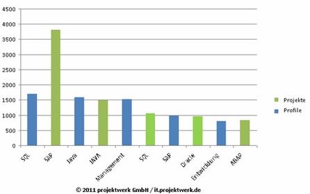 Besonders deutlich wird die Diskrepanz für Anforderungen im SAP Umfeld. SAP wurde unter Anforderungen für Projekte 3.800mal genannt. Das ist mit Abstand der erste Platz. Bei den angebotenen Kenntnissen der Freiberufler findet sich SAP dagegen mit rund 1000 Nennungen nur auf dem vierten Rang.