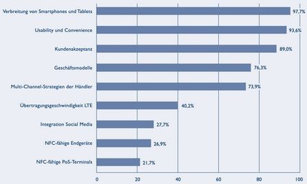 Die Einführung des neuen Übertragungsstandards „Long-Term-Evolution“ (LTE) wirkt sich laut der Studie hingegen nur für 40 Prozent der Befragten auf den Erfolg von M-Commerce aus. Die neue Technologie der „Near Field Communication“ (NFC) spielt ebenso nur eine untergeordnete Rolle mit 27 Prozent Zustimmung bei NFC-fähigen Endgeräten und 22 Prozent bei NFC-fähigen Terminals. Die Integration von Social Media wird demnach immerhin noch von fast einem Drittel als erfolgsentscheidend eingeschätzt.