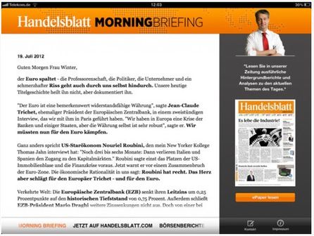 Der MorningBriefing Newsletter vom Chefredakteur des Handelsblatt Gabor Steingart ist nun über seine eigene App auf dem iPad lesbar. Entwickelt hat sie die Freiburger Tripicchio AG hat in Zusammenarbeit mit der Handelsblatt Verlagsgruppe. In den ersten 14 Tagen wurde die App mehr als 10.000 Mal heruntergeladen und übertrifft damit alle Erwartung seitens der Verlagsgruppe Handelsblatt.