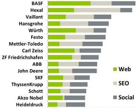 Große Unternehmen wie BASF sind mit über 8000 Suchworten in den Toplisten von Google präsent. 40 Prozent der 45 untersuchten B2B-Unternehmen sind jedoch mit weniger als tausend Suchworten vertreten. Viele davon nur mit Kombinationen des eigenen Firmennamens statt mit den für die Neukundengewinnung interessanten generischen Begriffen. BASF ist mit Suchworten wie "Duales Studium International", "Bernsteinsäure" oder "Volontariat Unternehmenskommunikation" auf der Google-Startseite vertreten. ABB steht mit Begriffen wie "Prozessautomation", "Generatorschalter" und "Trockentransformatoren" auf Platz eins. Vaillant schätzt sich glücklich, mit "Gasheizung", "Mikro Blockheizkraftwerk" und "Heizung modernisieren" Googles Rang eins zu belegen. Für viele Webseiten kommt der Großteil des Traffic bereits aus dem Ausland. Bei Akzo Nobel und SKF steht Indien ganz oben auf der Liste der Herkunftsländer, ebm-papst, Heideldruck und Schaeffler dagegen sind eher in China stark.
