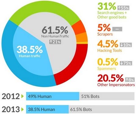 Das US-Amerikanische Unternehmen incapsula, das Websicherheitslösungen anbietet, hat sich zum zweiten Mal in einer Studie dem Bot-Traffic gewidmet. Dabei wertet incapsula über 90 Tage den Traffic von 20.000 Webseiten aus dem eigenen Netzwerk aus. Von den gezählten 1,45 Milliarden Visits sind demnach mehr als die Hälfte, nämlich 61,5 Prozent, nicht von echten Nutzern, sondern von Bots verursacht.