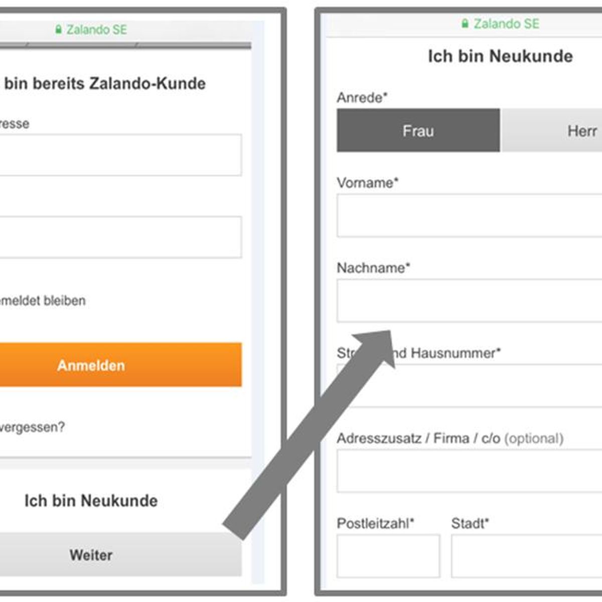 Neukunden müssen zunächst Ihre persönlichen Daten beziehungsweise Adressdaten angeben. Hier sollten Sie auf ein schlankes Design Wert legen. Das Formular sollte so übersichtlich und reduziert wie möglich gestaltet werden. Denken Sie immer daran, dem User einen schnellen Fortschritt gewährleisten zu wollen. Das heißt: Fordern Sie lediglich die wichtigsten Daten und verzichten Sie auf unnötige Elemente.