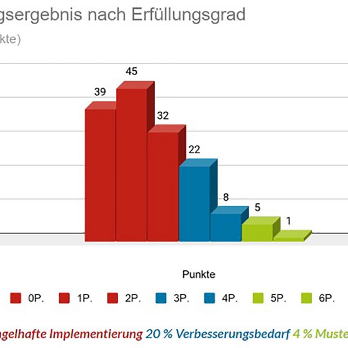 Nur ein Unternehmen macht alles richtig und erreicht die Höchstpunktzahl von sechs Punkten. 20 Prozent der Unternehmen sind recht gut aufgestellt, weisen aber einen Verbesserungsbedarf auf. 39 Unternehmen erhalten null Punkte, 45 einen Punkt.