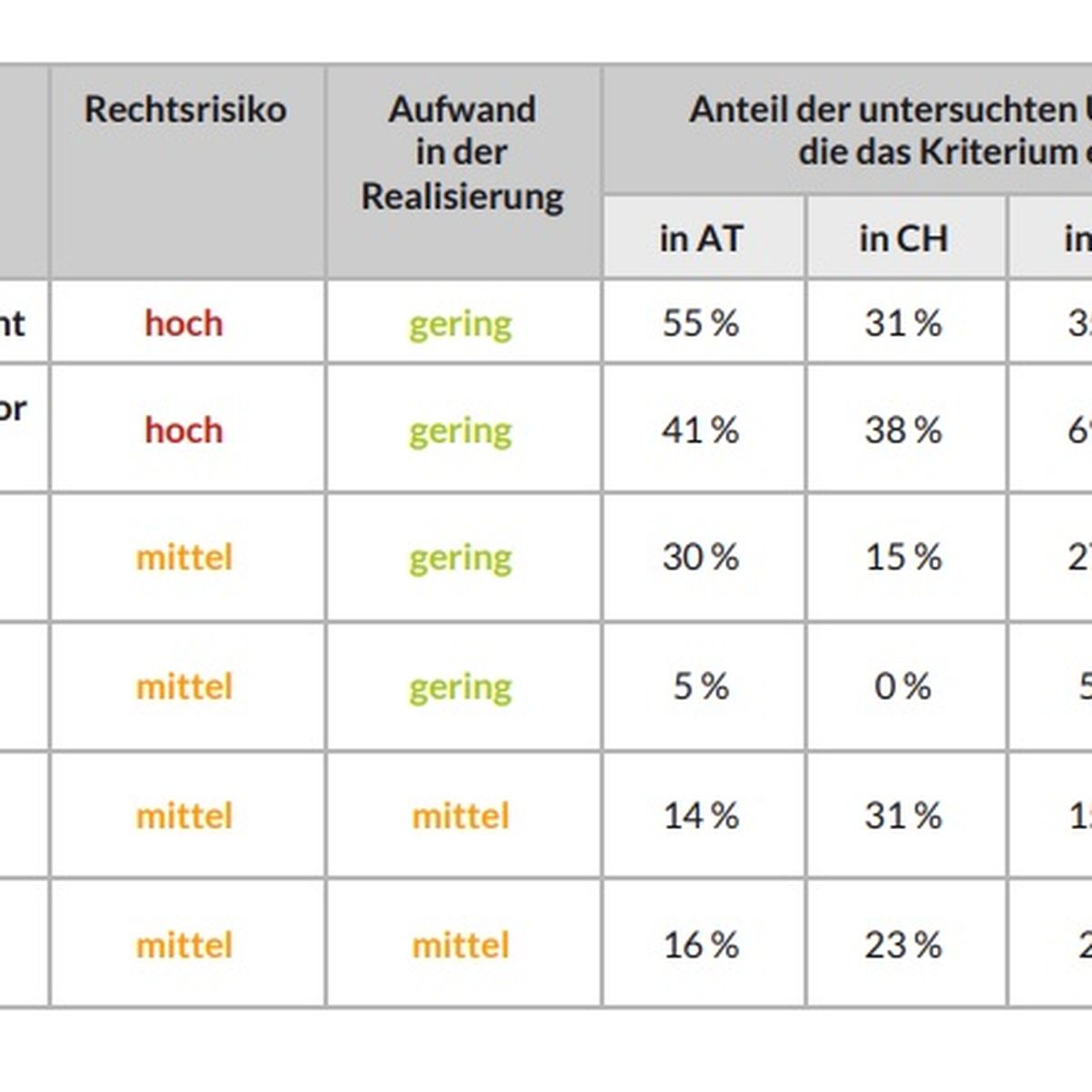 Von der Evaluierung ausgeschlossen waren die Kriterien, ob die Datenschutzerklärung vollständig war und ob die ausgespielten Technologien mit den Erklärtexten in der Datenschutzerklärung übereinstimmten.
